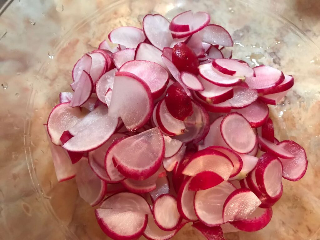 Ingredientes: Preparação: Lave e lamine os rabanetes em rodelas muito finas. Coloque numa taça, junte umas pedras de sal, e amasse com as mãos. Deve